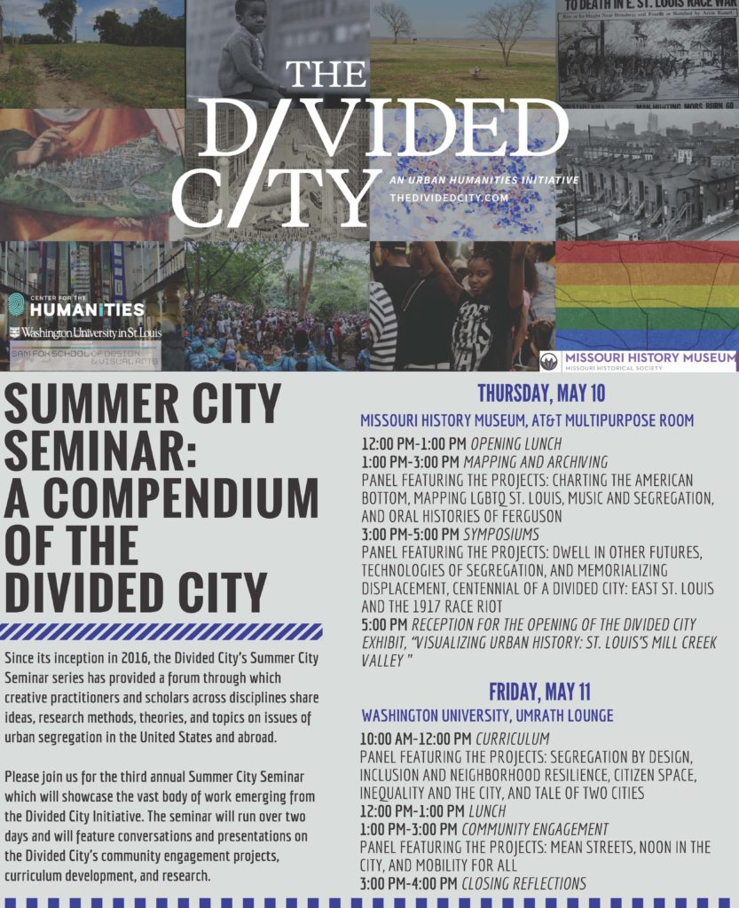 Since its inception in 2016, the Divided City’s Summer City Seminar series has provided a forum through which creative practitioners and scholars across disciplines and from colleges and universities throughout the St. Louis area share ideas, research methods, theories, and topics on issues of urban segregation in the United States and abroad. The Summer City Seminar has been effective in bringing Architecture, Urban Design, and Humanities scholars into regular dialogue.