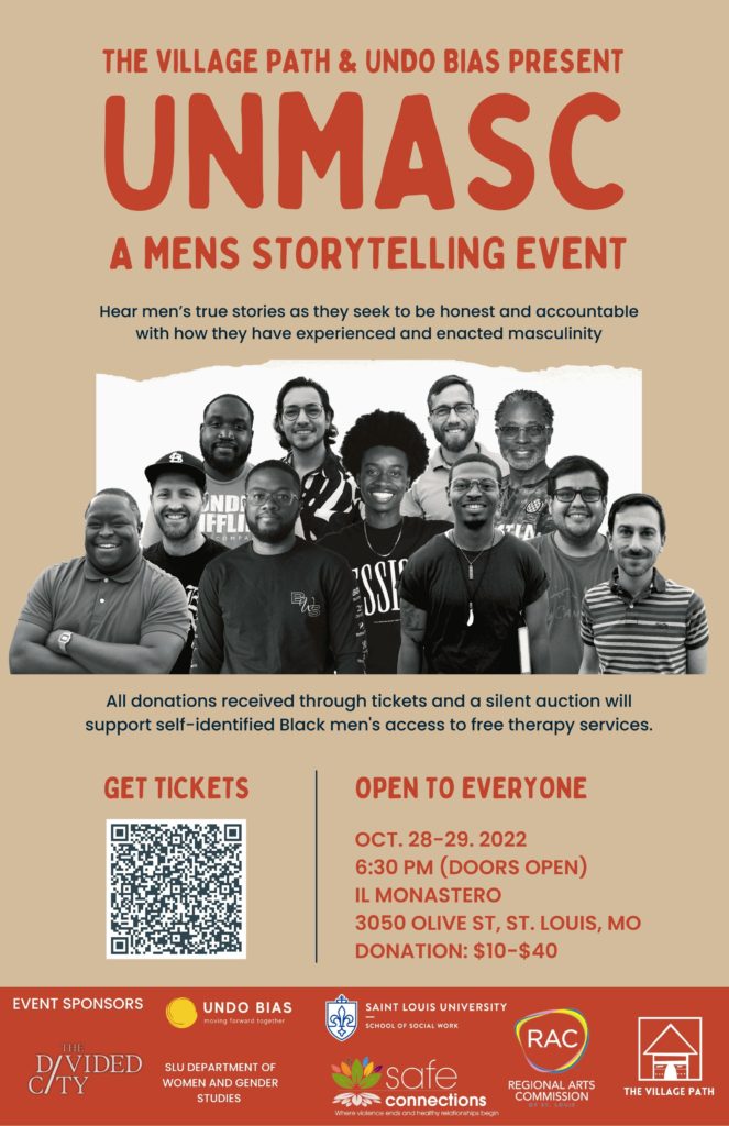 During Violence Prevention Month The Village PATH and Undo Bias will be co-hosting the production of UnMasc (A Mens Storytelling Event) on October 28th, 2022 and October 29th. This event will take place at Il Monastero, located at Il Monastero  Banquet Center, 3050 Olive St, St. Louis, MO 63103 on the campus of Saint Louis University.
